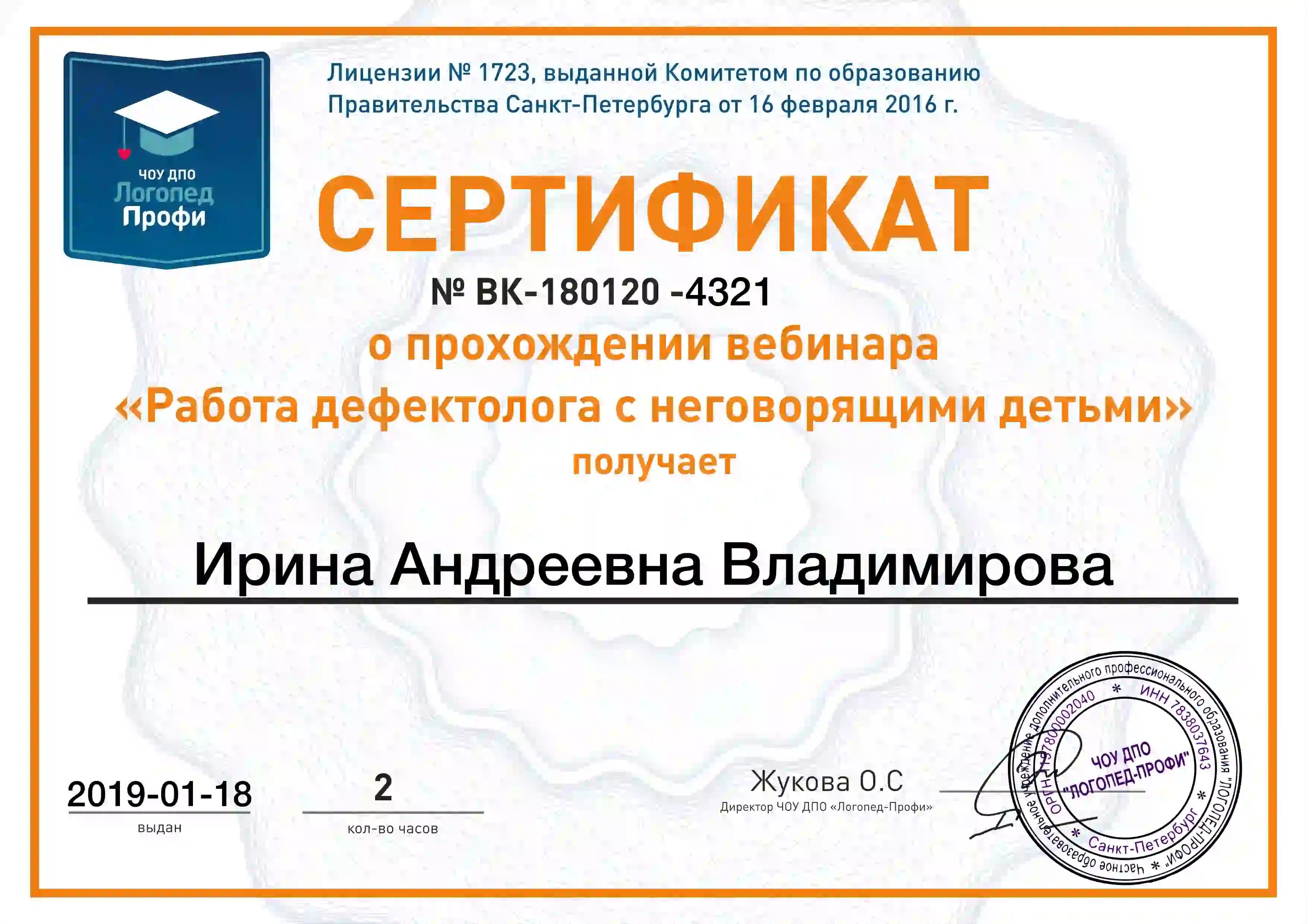 Закончила Ленинградский государственный университет им. А.С. Пушкина, специальность – специальное (дефектологическое) образование.